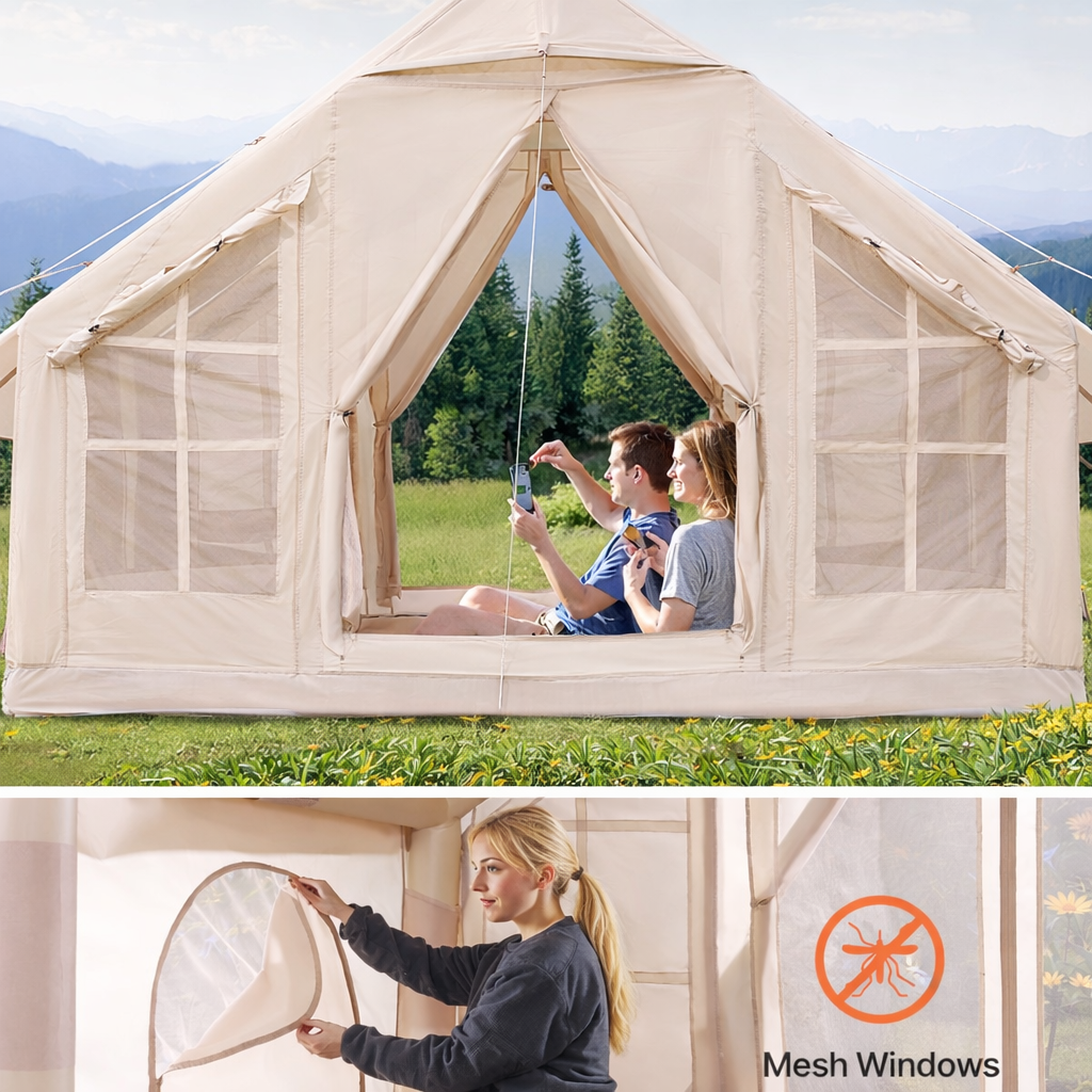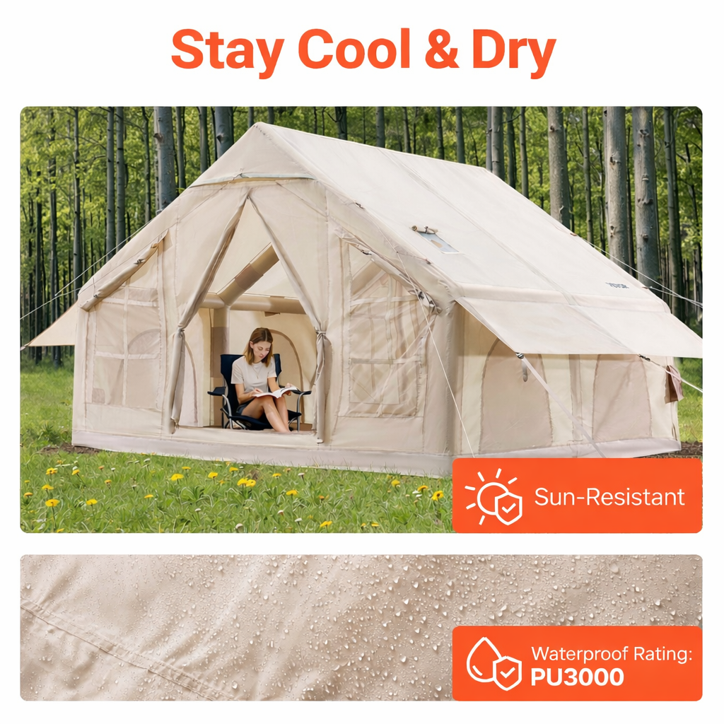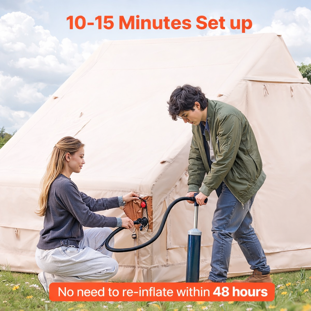 High-pressure pump included. Inflate in 10-15 minutes with pressure valve protection. No traditional poles, no hassle. Stays inflated 48+ hours.