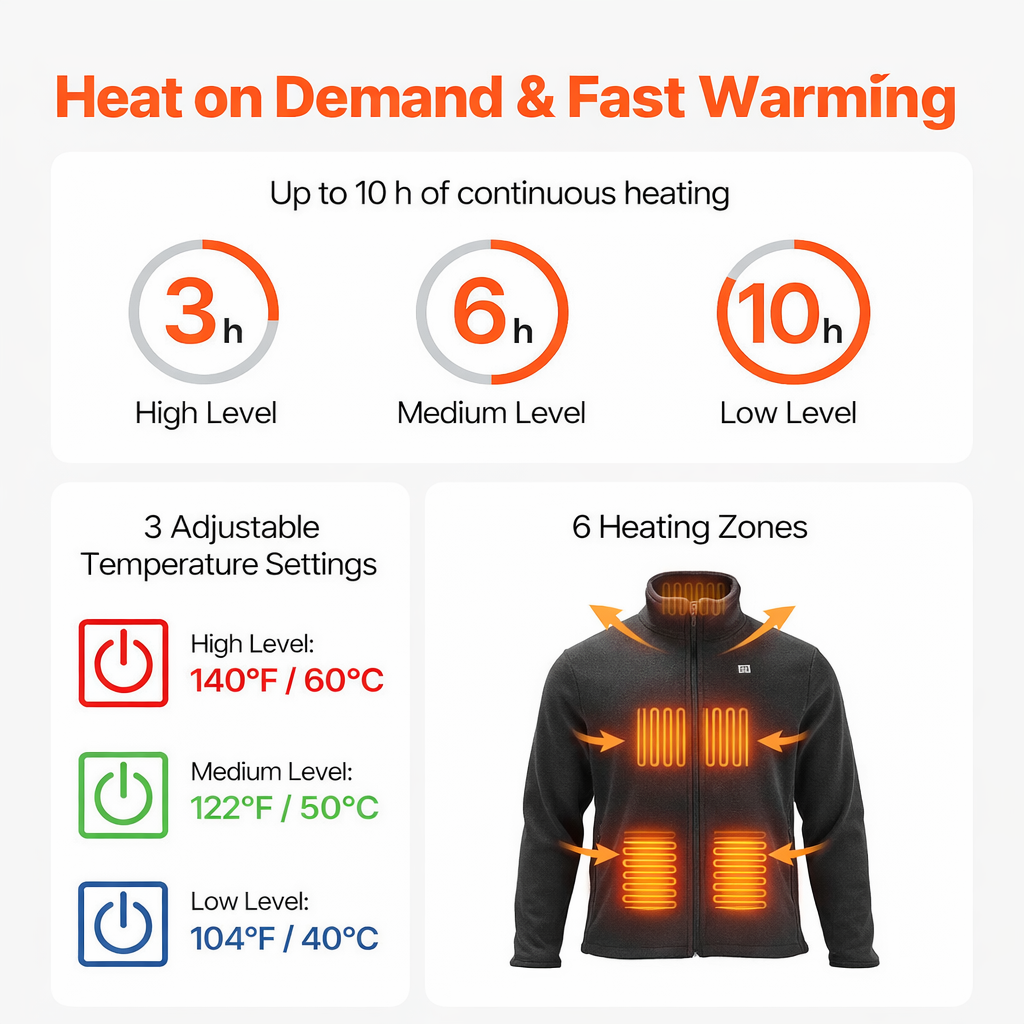 Unisex Heated Fleece Jacket Infographic - 6 Heating Zones, 16000mAh Battery, Temperature Settings